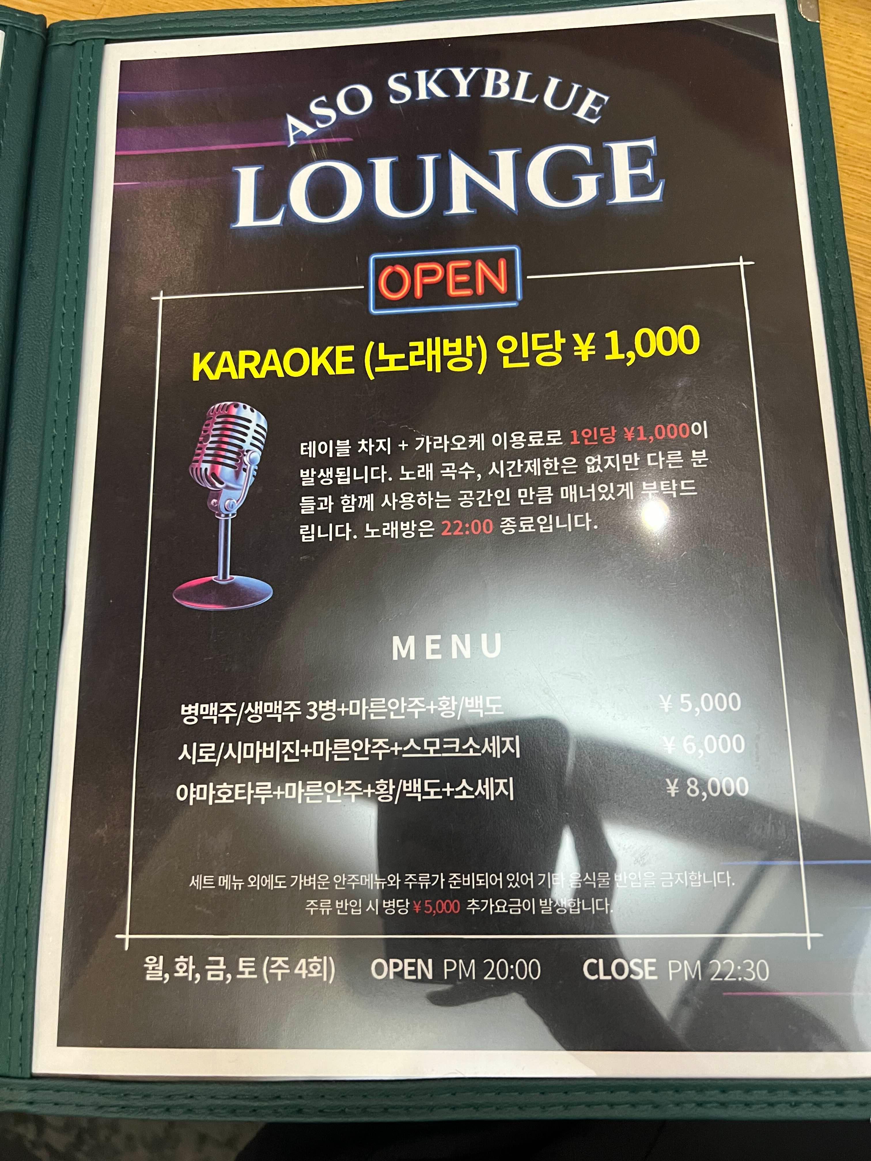 테이블차지와 가라오케 이용료가 1인당 1000엔이 발생됩니다.