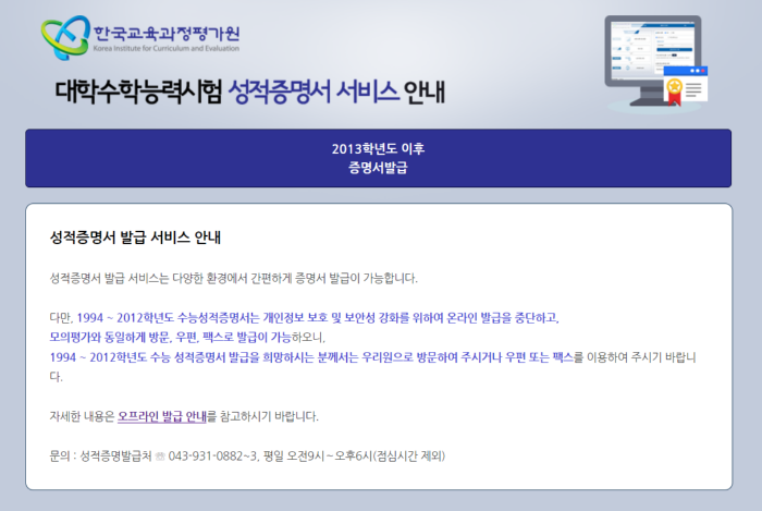 1994년부터 2012학년도 수능성적증명서는 온라인 발급이 불가능하며 방문, 우편, 팩스로 발급이 가능합니다.